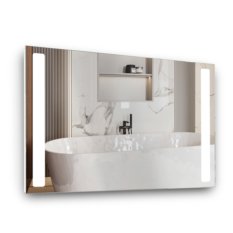 KERID - модель дзеркала із фронтальною підсвіткою прямокутної форми. Зона світіння припадає на дві паралельні смужки, котрі йдуть по два боки полотна. Такий тип підсвітки дозволяє отримати яскраве підсвічування, що актуально для ванної кімнати або ж навіть передпокою.