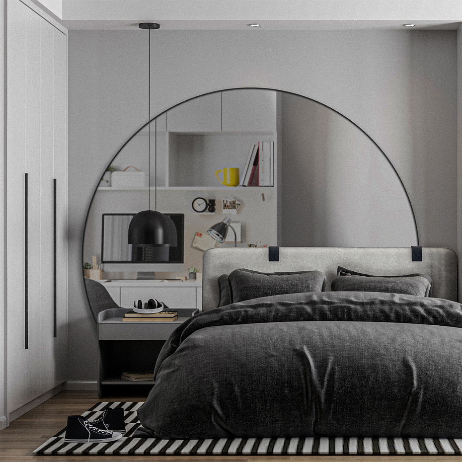 Найдоцільніше розмістити за двоспальним ліжком, позаду масивного дивану або тумби. Зрізаний низ візуально занижує центр ваги дзеркала, що своєю чергою створює природно звичну композицію з наведеними елементами інтер'єру.
