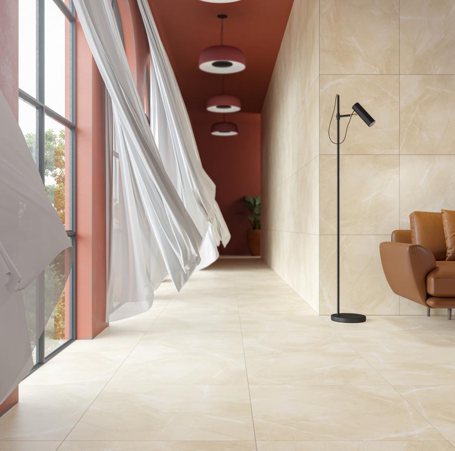 Імітація світлого мармуру кольору шампань підкреслить лаконічність інтер'єру та скоригує його баланс.