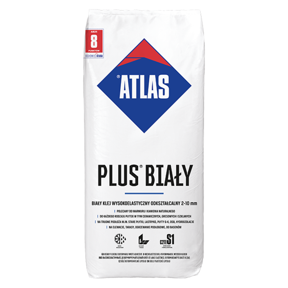 У рецептурі білого еластичного клею для плитки ATLAS PLUS BIAŁY використовується полімерна технологія. Завдяки високому вмісту редиспергованих полімерних смол, цементний клей набуває унікальних властивостей, роблячи його продуктом з найвищими технічними та експлуатаційними параметрами, гарантуючи довговічність. Наявність полімерів в клейовій суміші забезпечує високу адгезію облицювання до будь-якої основи, а також до так званих складних та критичних основ. Завдяки переплітанню полімерної мережі з мережею неорганічних цементних гідратних зв'язків, клей для плитки ATLAS PLUS BIAŁY отримує виняткові параметри.