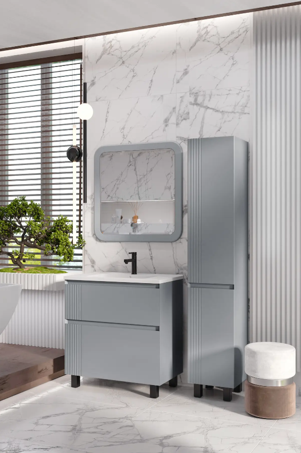 В колекції: тумба підлогова та підвісна з умивальником та пенал.