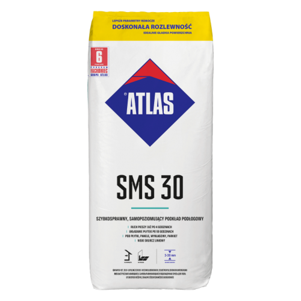 Самовирівнюючу суміш для підлог ATLAS SMS 30 завдяки гладкій поверхні, яку вона створює, і дрібному заповнювачу, рекомендується використовувати як стяжку під облицювальне покриття.