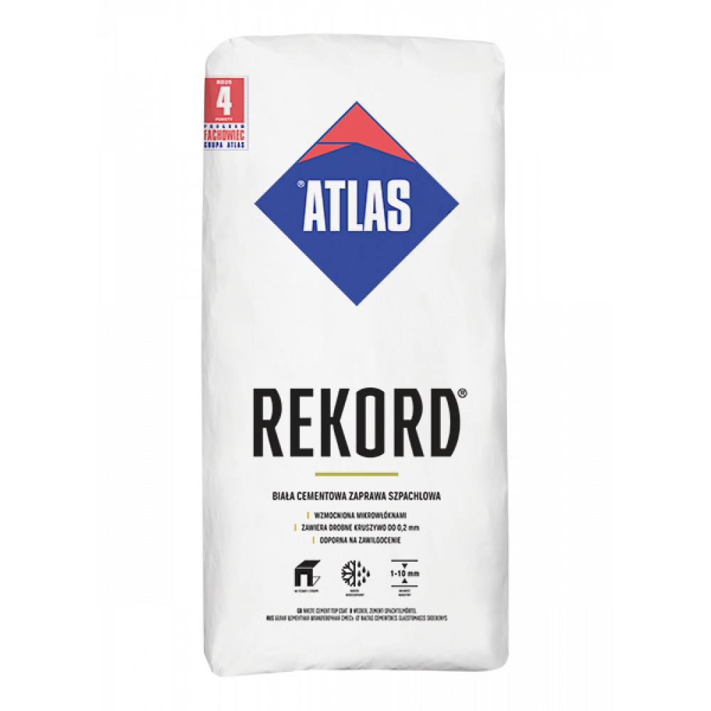 ATLAS REKORD шпаклівка на основі білого цементу дозволяє згладжувати тонкошарові штукатурки – які виконані, як на традиційних штукатурках, так і на шарах теплоізоляції (не елементом систем теплоізоляції).
